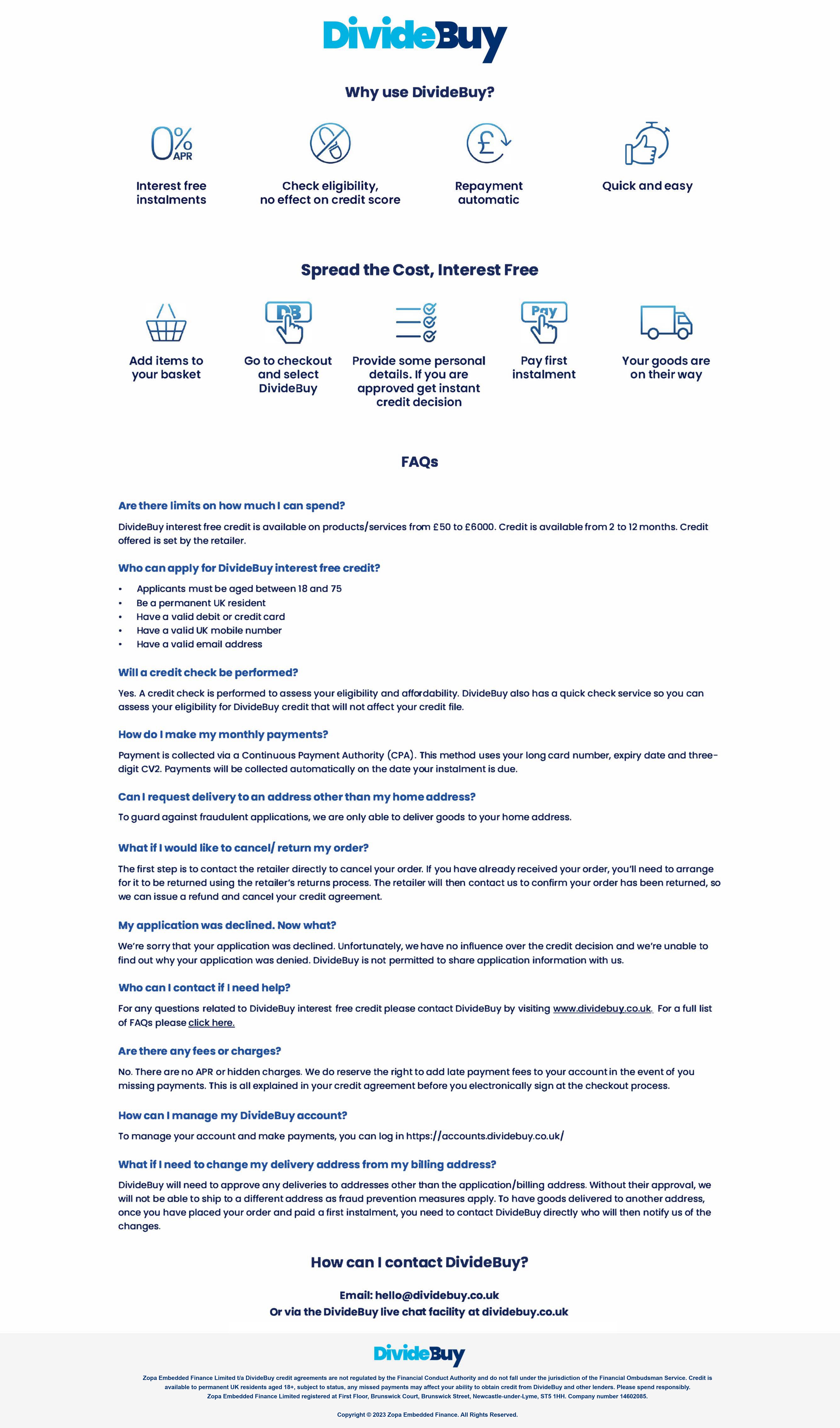 Interest free credit agreements provided by Zopa Embedded Finance Limited trading as DivideBuy are not regulated by the Financial Conduct Authority and do not fall under the jurisdiction of the Financial Ombudsman Service.